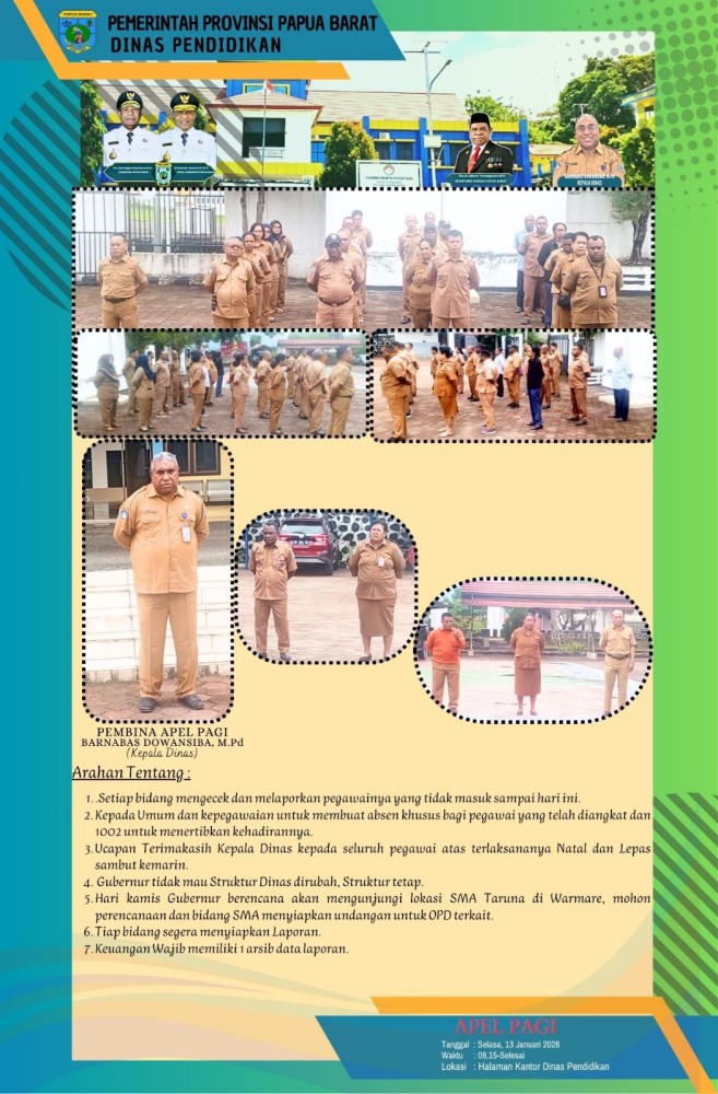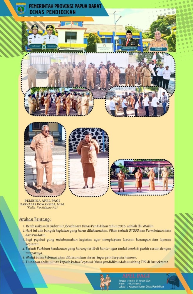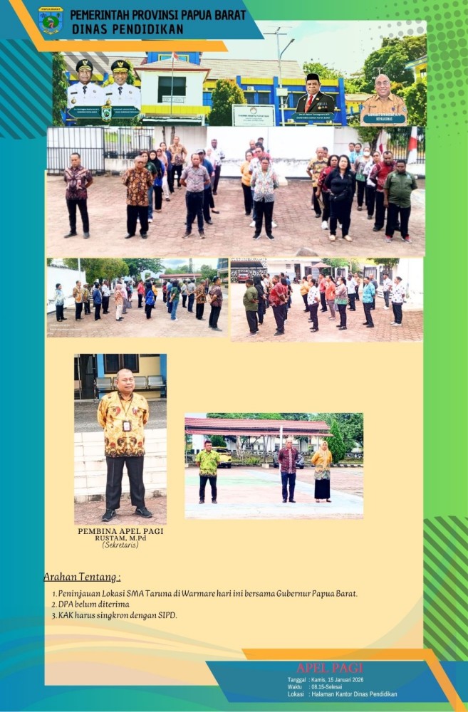 Puji syukur kita panjatkan ke hadirat Tuhan Yang Maha Esa, karena atas rahmat dan karunia-Nya, Website Dinas Pendidikan Provinsi Papua Barat dapat hadir sebagai salah satu sarana informasi dan komunikasi bagi masyarakat luas dengan Moto : “Membangun Pendidikan dengan hati bukan logika”. Seiring dengan perkembangan teknologi informasi dan tuntutan pelayanan publik yang semakin transparan, akuntabel, dan cepat, Dinas Pendidikan Provinsi Papua Barat berkomitmen untuk terus berinovasi dalam meningkatkan kualitas layanan pendidikan. Kehadiran website ini merupakan wujud nyata dari komitmen tersebut, sekaligus sebagai langkah strategis dalam mendukung penyelenggaraan pemerintahan berbasis elektronik (e-Government). Website Dinas Pendidikan Provinsi Papua Barat diharapkan dapat menjadi media informasi yang akurat, terbuka, dan mudah diakses oleh seluruh pemangku kepentingan pendidikan, baik peserta didik, pendidik dan tenaga kependidikan, orang tua, satuan pendidikan, maupun masyarakat umum. Melalui website ini, kami menyajikan berbagai informasi terkait kebijakan pendidikan, program dan kegiatan, pengumuman resmi, data pendidikan, serta layanan yang dibutuhkan oleh masyarakat. Kami menyadari bahwa peningkatan mutu pendidikan tidak dapat dilakukan secara sendiri-sendiri, melainkan membutuhkan dukungan, partisipasi, dan kolaborasi dari seluruh pihak. Oleh karena itu, kami berharap website ini juga dapat menjadi ruang komunikasi dan interaksi yang konstruktif antara Dinas Pendidikan dan masyarakat, guna bersama-sama membangun pendidikan Papua Barat yang berkualitas, inklusif, dan berkeadilan. Akhir kata, kami mengucapkan terima kasih kepada seluruh pihak yang telah berkontribusi dalam pengembangan website ini. Semoga kehadiran Website Dinas Pendidikan Provinsi Papua Barat dapat memberikan manfaat yang sebesar-besarnya bagi kemajuan dunia pendidikan di Tanah Papua. Tuhan memberkati.
